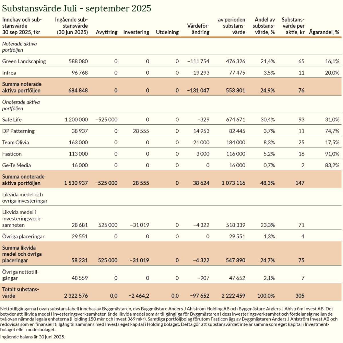 För att ge en transparent och rättvisande bild av Byggmästarens faktiska värde rapporterar Byggmästaren substansvärde på kvartalsbasis. Substansvärde refererar till marknadsvärdet på Byggmästarens innehav i olika portföljbolag, likvida medel och andra tillgångar minus dess totala skulder. Byggmästarens värderingsansats följer IFRS-ramverket och värdehierarkierna 1-3. Substansvärde redovisas alltid per innehav, totalt och per aktie.