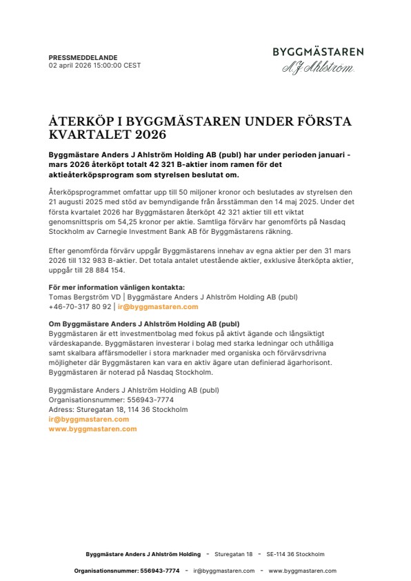 Byggmästare Anders J Ahlström Holding AB (publ) har under perioden januari – mars 2026 återköpt totalt 42 321 B-aktier inom ramen för det aktieåterköpsprogram som styrelsen beslutat om.