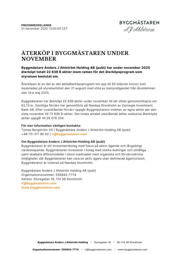 Byggmästare Anders J Ahlström Holding AB (publ) har under november 2025 återköpt totalt 22 636 B aktier inom ramen för det återköpsprogram som styrelsen beslutat om.