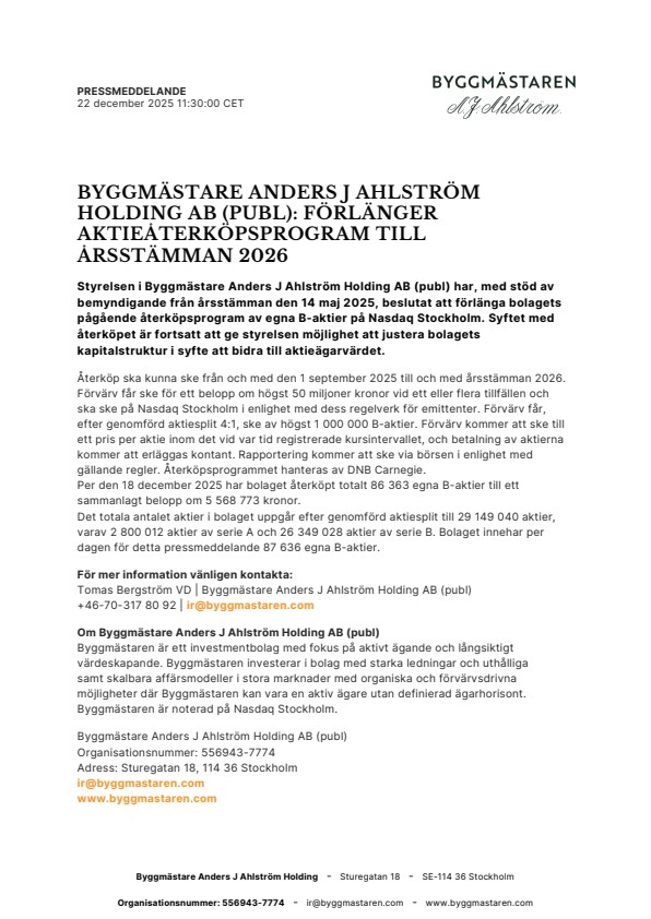 Styrelsen i Byggmästare Anders J Ahlström Holding AB (publ) har, med stöd av bemyndigande från årsstämman den 14 maj 2025, beslutat att förlänga bolagets pågående återköpsprogram av egna B-aktier på Nasdaq Stockholm. Syftet med återköpet är fortsatt att ge styrelsen möjlighet att justera bolagets kapitalstruktur i syfte att bidra till aktieägarvärdet.