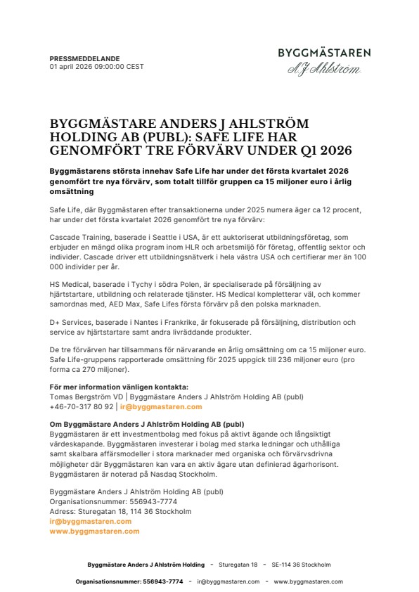 Byggmästarens största innehav Safe Life har under det första kvartalet 2026 genomfört tre nya förvärv, som totalt tillför gruppen ca 15 miljoner euro i årlig omsättning