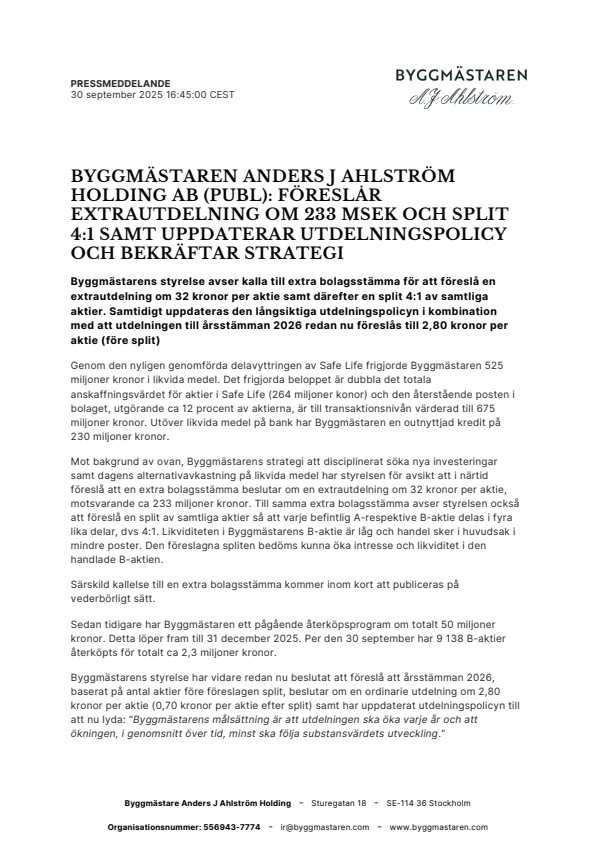 Byggmästarens styrelse avser kalla till extra bolagsstämma för att föreslå en extrautdelning om 32 kronor per aktie samt därefter en split 4:1 av samtliga aktier. Samtidigt uppdateras den långsiktiga utdelningspolicyn i kombination med att utdelningen till årsstämman 2026 redan nu föreslås till 2,80 kronor per aktie (före split)