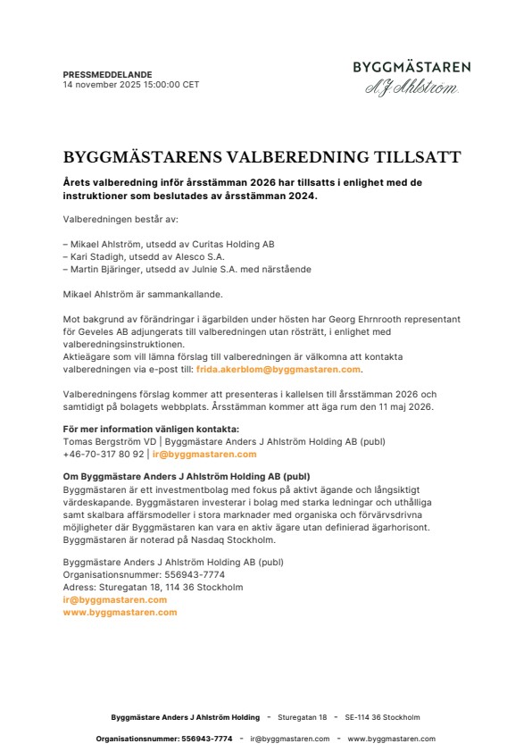 Aktieägare som vill lämna förslag till valberedningen är välkomna att kontakta valberedningen via e-post till: frida.akerblom@byggmastaren.com.