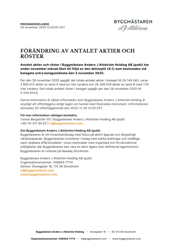Antalet aktier och röster i Byggmästare Anders J Ahlström Holding AB (publ) har under november månad ökat till följd av den aktiesplit (4:1) som beslutades vid bolagets extra bolagsstämma den 3 november 2025.