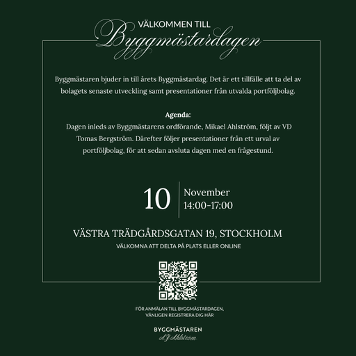 Byggmästaren bjuder in till årets Byggmästardag måndagen den 10 november. Det är ett tillfälle att ta del av bolagets senaste utveckling, framtidsplaner och presentationer från utvalda portföljbolag.