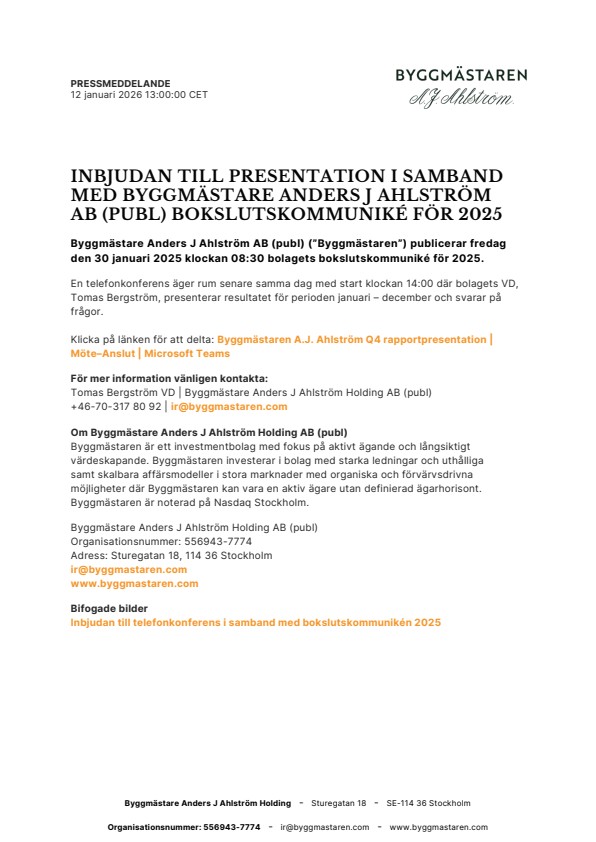 Byggmästare Anders J Ahlström AB (publ) (”Byggmästaren”) publicerar fredag den 30 januari 2025 klockan 08:30 bolagets bokslutskommuniké för 2025.