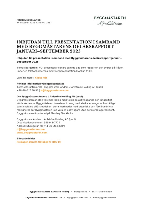 Inbjudan till presentation i samband med Byggmästarens delårsrapport januari–september 2025